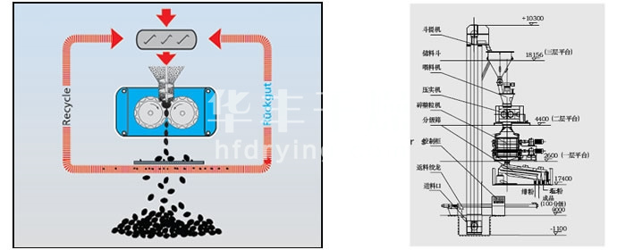 对辊式挤压造粒的工艺原理是:干物料在压力作用下团聚成致密坚硬的大块(饼料),称为挤压过程;饼料再被破碎筛分后成为颗粒料称为造粒过程。挤压的作用一是将颗粒间的空气挤掉,另外是使颗粒间距达到足够近,以产生如范德华力、吸附力、晶桥及内嵌连接等吸引力。挤压造粒的颗粒主要是靠分子之间的作用力形成的颗粒强度。
