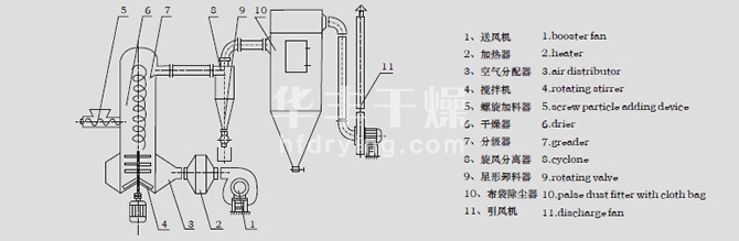 热空气切线进入干燥器底部,在搅拌器带动下形成强有力的旋转风场。膏状物料由螺旋加料器进入干燥器内,在高速旋转搅拌桨的强烈作用下,物料受撞击、磨擦及剪切力的作用下得到分散,块状物料迅速粉碎,与热空气充分接触、受热、干燥。脱水后的干物料随热气流上升,分级环将大颗粒截留,小颗粒从环中心排出干燥器外,由旋风分离器和除尘器回收,未干透或大块物料受离心力作用甩向器壁,重新落到底部被粉碎干燥。