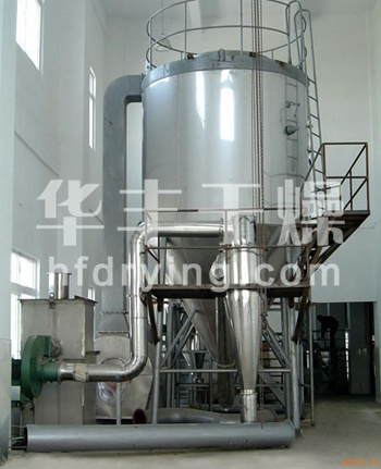 空气经过滤和加热,进入干燥器顶部空气分配器,热空气呈螺旋状均匀地进入干燥室。料液经塔体顶部的高速离心雾化器,(旋转)喷雾成极细微的雾状液珠,与热空气并流接触在极短的时间内可干燥为成品。成品连续地由干燥塔底部和旋风分离器中输出,废气由风机排空。