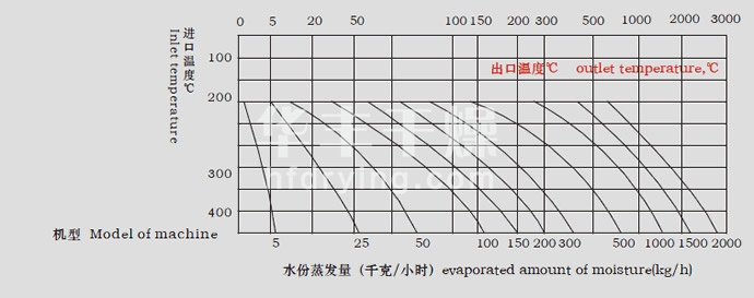 注:水份蒸发量与物料的特性及热进风、出口温度相关。当出口温度为90oC,其水份蒸发曲线见上图(供选型参考),随着产品不断更新,有关参数变更,恕不预先通知。