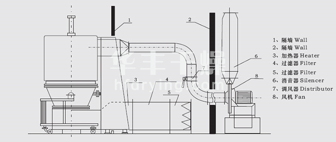 空气经加热净化后,由引风机从下部导入,穿过料斗的孔网板。在工作室内,经搅拌和负压作用形成流态化,水份快速蒸发后随着排气带走,物料快速干燥。